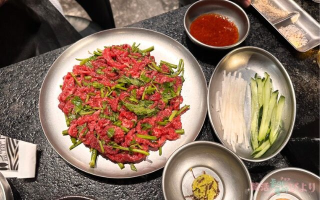甘めのタレが絡んだ韓牛ユッケは、クセがなく食べやすい味。新鮮なセリとの相性も抜群で、前菜としても大活躍の一皿です。