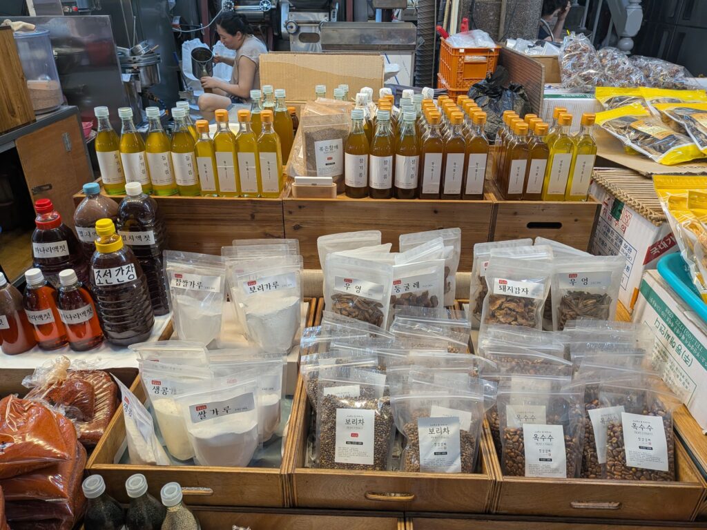 その場で瓶詰めしてくれる新鮮なごま油は、韓国でしか買えないおみやげにぴったりです!