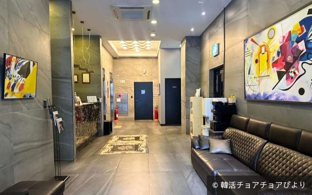 ロビーはコンパクトながらスタイリッシュで清潔感のある空間。大理石調の内装やアートが印象的で、落ち着いた雰囲気の中でゆっくりチェックインできます。