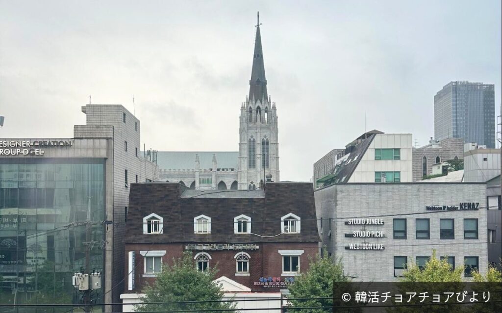 駅の近くには、中央に尖塔を持つソウル教区のカトリック教会「論峴洞(ノニョンドン)聖堂(논현동성당)」があり、ホテル周辺は静かで落ち着いた雰囲気です。