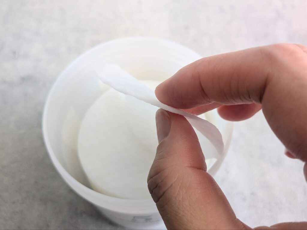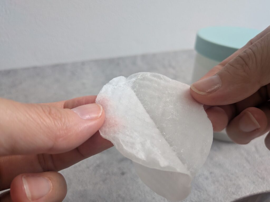 朝晩どちらにも使えますが、私は朝は1枚を半分の薄さに割いて、Tゾーンや頬、あごに貼るコットンパックとして使うのがお気に入り。